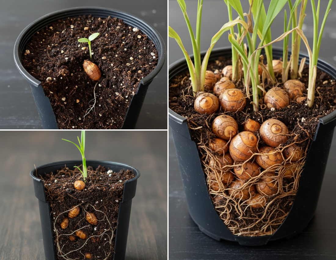 У цей період під землею відбувається головне: зачатки перетворюються на справжні міні-бульби, які швидко збільшуються у розмірі й стають щільнішими. Їх може бути десятки або навіть сотні, якщо горщик достатньо просторий. Над землею рослина виглядає зеленішою і густішою, але основна “магія” — під ґрунтом.