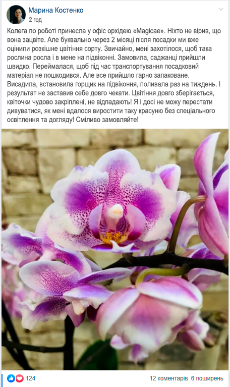Орхідея «Magicae» не вимагає особливого догляду, та прекрасно себе почуває в умовах наших не сонячних морозних зим. Гібридна розробка представлена у трьох кольорах на вибір. З появою кімнатної орхідеї «Magicae» ви зрозумієте, що вирощувати цю, на перший погляд, примхливу квітку, надзвичайно просто!