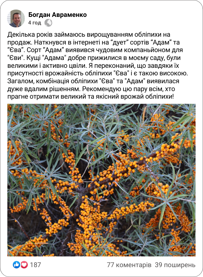 "Адам" - чоловічий сорт обліпихи з чудовою витривалістю