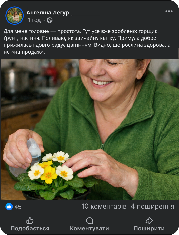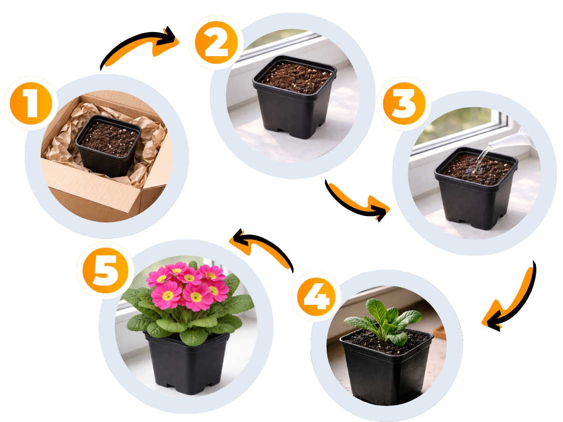 Наша примула — це інший підхід. Ми використовуємо спеціально підібраний поживний субстрат, у якому рослина може нормально рости, а не “доживати”. Насіння вже висаджене правильно, у стабільне середовище, без стресу від пересадок і різких змін. Саме тому примула не бореться за виживання — вона одразу запускає ріст і готується до цвітіння.