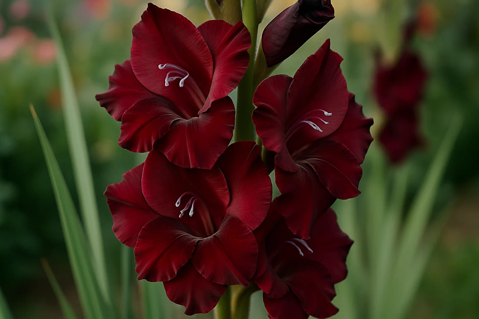 ✅ Унікальний глибокий колір: насичений майже чорний відтінок з винно-бордовими переливами — рідкість у гладіолусів. Такий колір створює розкішний акцент у сучасному інтер’єрі, на підвіконні чи декоративній полиці.